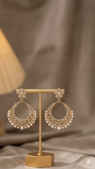 Ye earrings na sirf beautiful hain balkay pehanne mein bhi bohat halki (lightweight) hain. Is mein bariki se jare gaye chamakte hue Zirconia (CZ) stones aur nazuk seed pearls iske look ko mazeed behtareen banate hain. Ye traditional Chandbali design Pakistani aur Indian traditional looks ke liye perfect hai, chahe wo shaadi (wedding) ho, party ho ya koi bhi festive occasion.